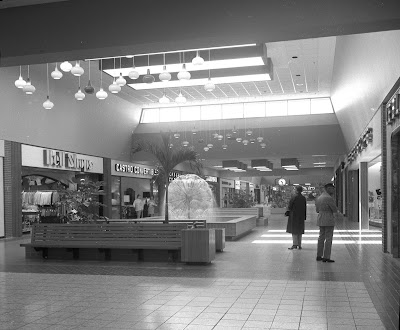 In this 1972 view, we see the Central Mall court. Bell Shops, Castro Convertibles, Casual Corner and Lerner Shops stores flank a sunburst fountain. A Sears nameplate is visible in the distance.