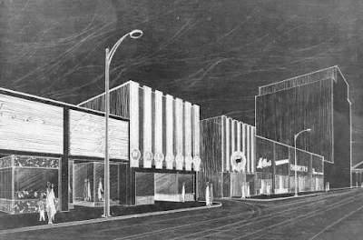 Another 1971 rendering; this of the interior of the prospective "climate-controlled mall for the Central Business District." The interior of the completed mall looked exactly like this drawing, except that most of the store spaces were never leased.