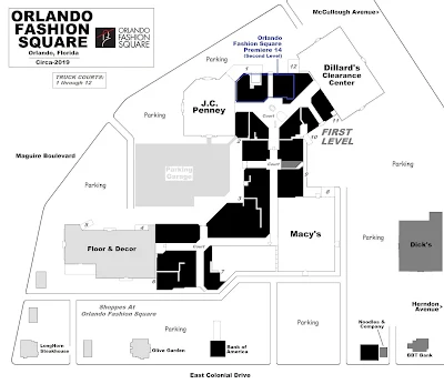 A Tennessee company acquired the mall in early 2013, but defaulted on their loan 5 years later. In the meantime, Dick's Sporting Goods, Noodles & Company and BBT buildings (in dark gray) were completed. A vacant Sears was replaced by SHOPPES AT ORLANDO FASHION SQUARE (light gray), which included Floor & Decor, a LongHorn Steakhouse and new location for Olive Garden.