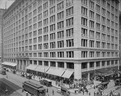 Carson, Pirie, Scott & Company, another Windy City retail institution, traced its beginnings back to 1854. The chain was founded by Scotsmen Samuel Carson and John T. Pirie. Robert Scott bought into the business in 1890. Operations moved into the store depicted above in 1904. It had been built -in 1888 and '89- for the Schlesinger & Mayer Company, sold to Harry Selfridge, sold again and then leased to Carson's.