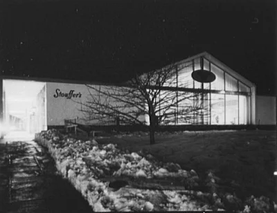 Stouffer's operated a full-service restaurant in the original WESTGATE CENTER. In this March 1954 view, we see the northwest corner of the Halle's anchor store on the left, with Stouffer's on the right.